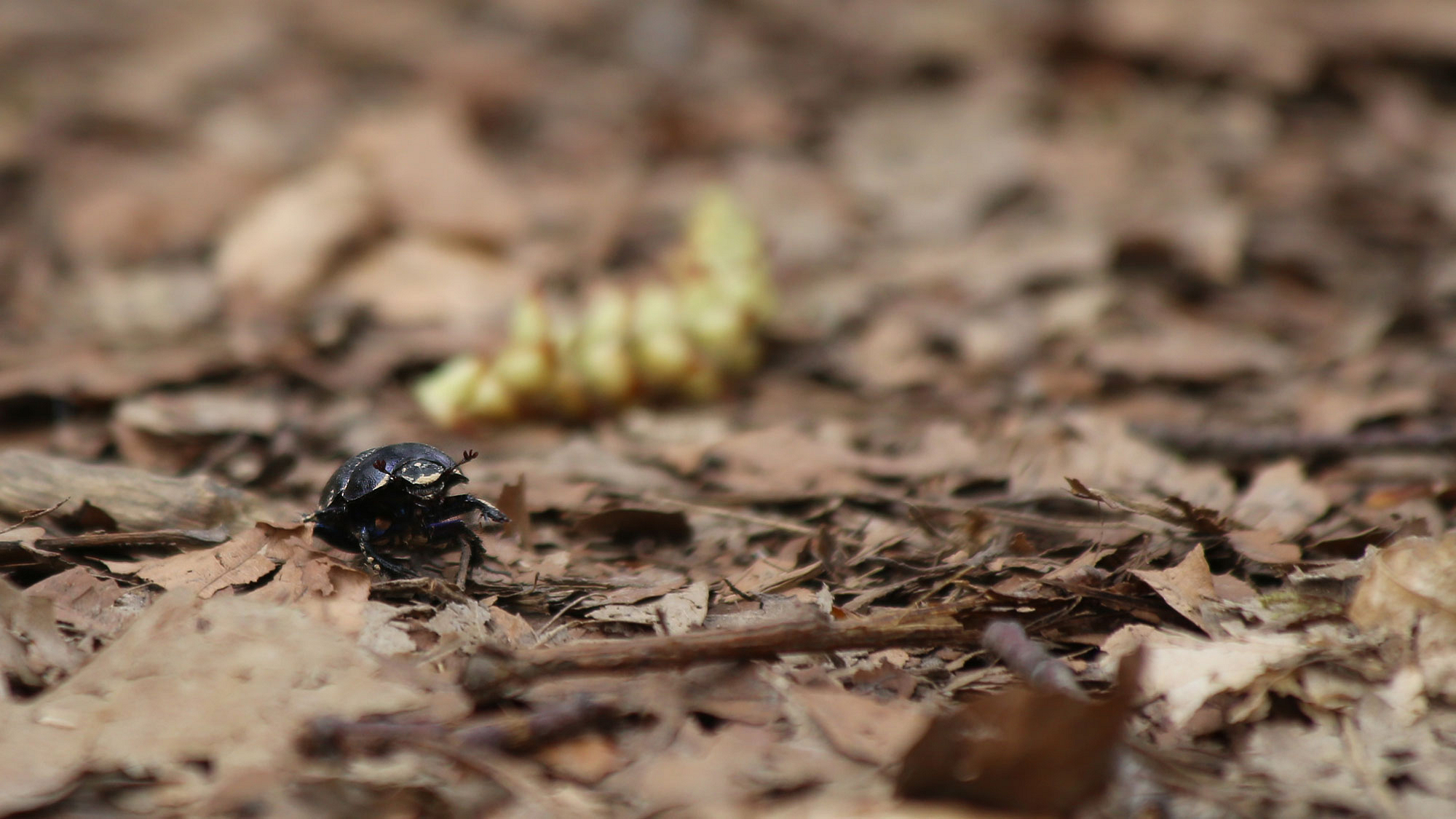 Ein Mistkäfer auf seinem beschwerlichen Weg durch den Wald.
