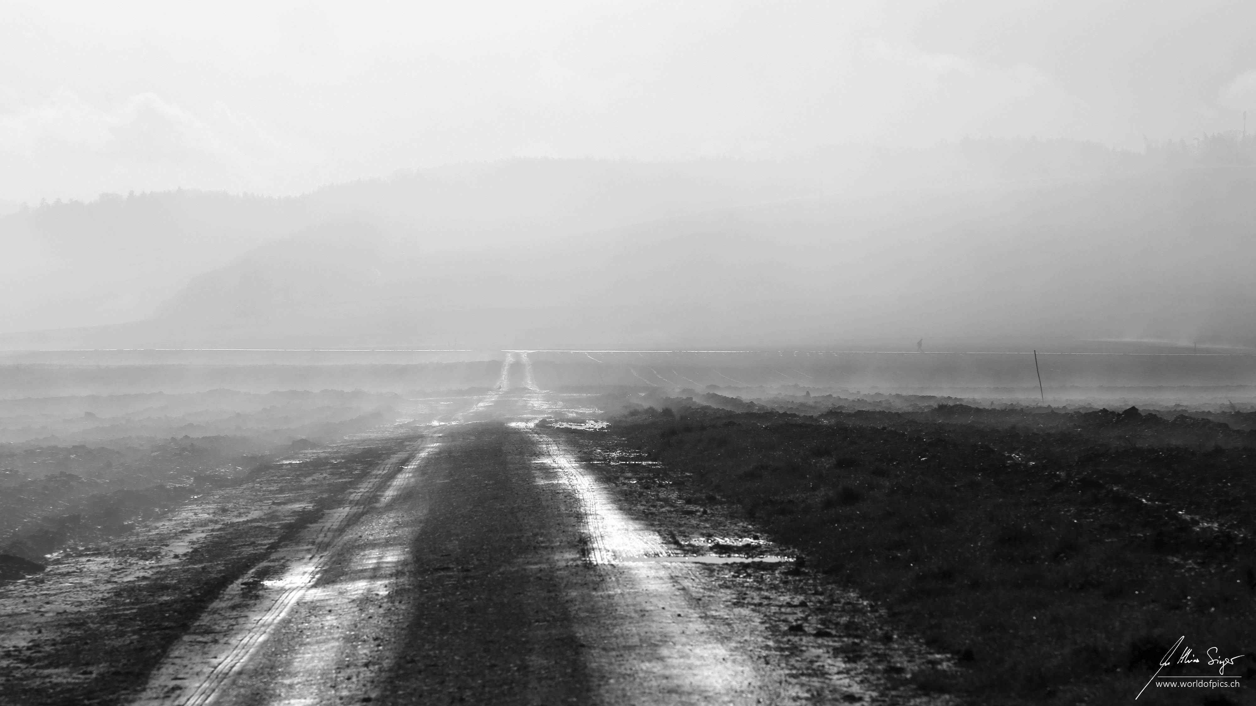 An einem frühen Morgen stiegen Nebelschwaden von der frisch gepflügten Erde auf. Ein einzelner Stock mitten auf dem Feld zieht den Blick auf sich, während die Strasse irgendwo in einen weiteren Feldweg mündet. Und darauf, allein auf weiter Flur, fast verschwunden im Dunst des Morgens, ein einsamer Wanderer.
