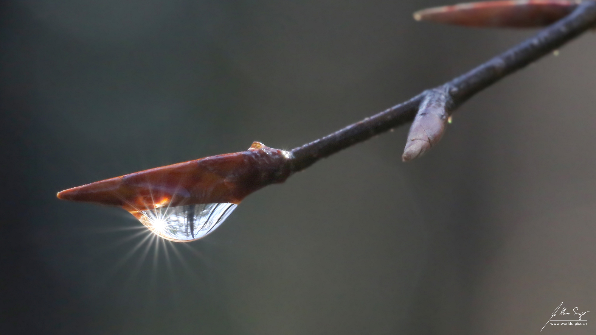 Die Herbstsonne sammelt ihre ganze Energie in einem einzelnen Tropfen an der Buchenknospe.
