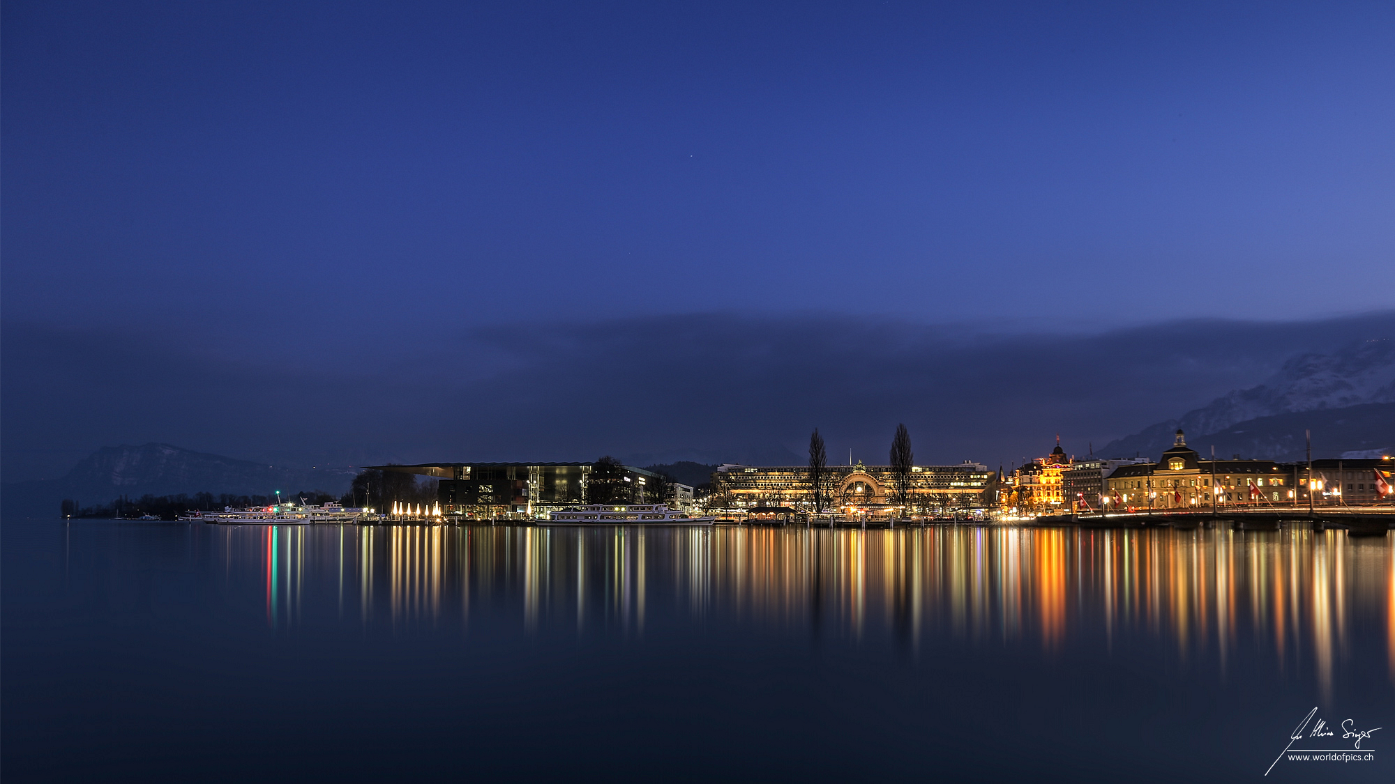 Blick von der Nordseite des Luzerner Seebeckens auf das KKL, den Luzerner Bahnhof sowie ganz link auf den Bürgenstock.