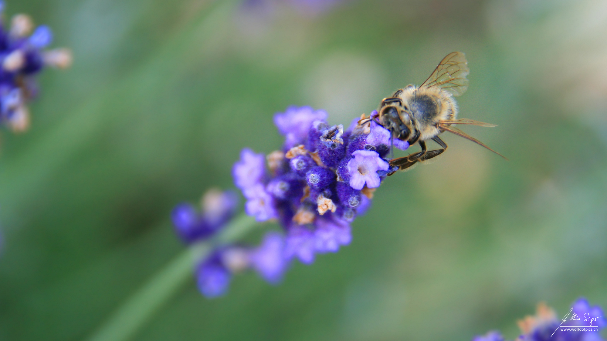 Eine Honigbiene nascht an einer Lavendelblüte. Die farbigen Blüten sind während der Tracktlücke, jener Zeit im Sommer, in der die Nahrungsquellen für die Bienen kaum mehr vorhanden sind, eine willkommene Abwechslung.