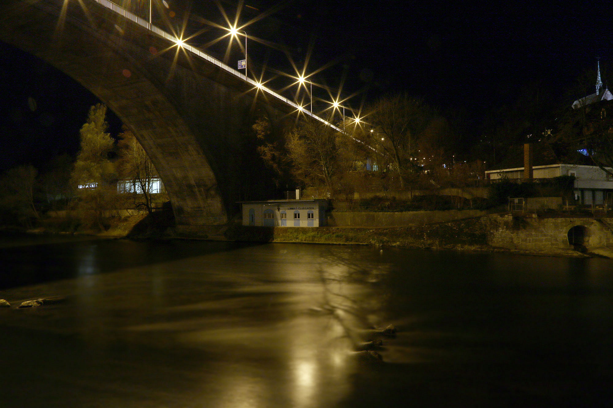 Fast ein wenig versteckt unter der hohen Limmatbrücke liegt das Clubhaus des Limmat-Club Baden. Spät abends scheint alles leer und verlassen, was aber nicht darüber hinwegtäuschen darf, dass die badener Wasserfahrer ein sehr aktiver Verein sind. Das Bild habe ich vom gegenüberliegenden "Tribguet"-Steg gemacht.