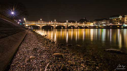 Die Mittlere Rheinbrücke in Basel. Im Hintergrund rechts von der Mitte die Martinskirche, etwas versteckt die Türme des Münsters.