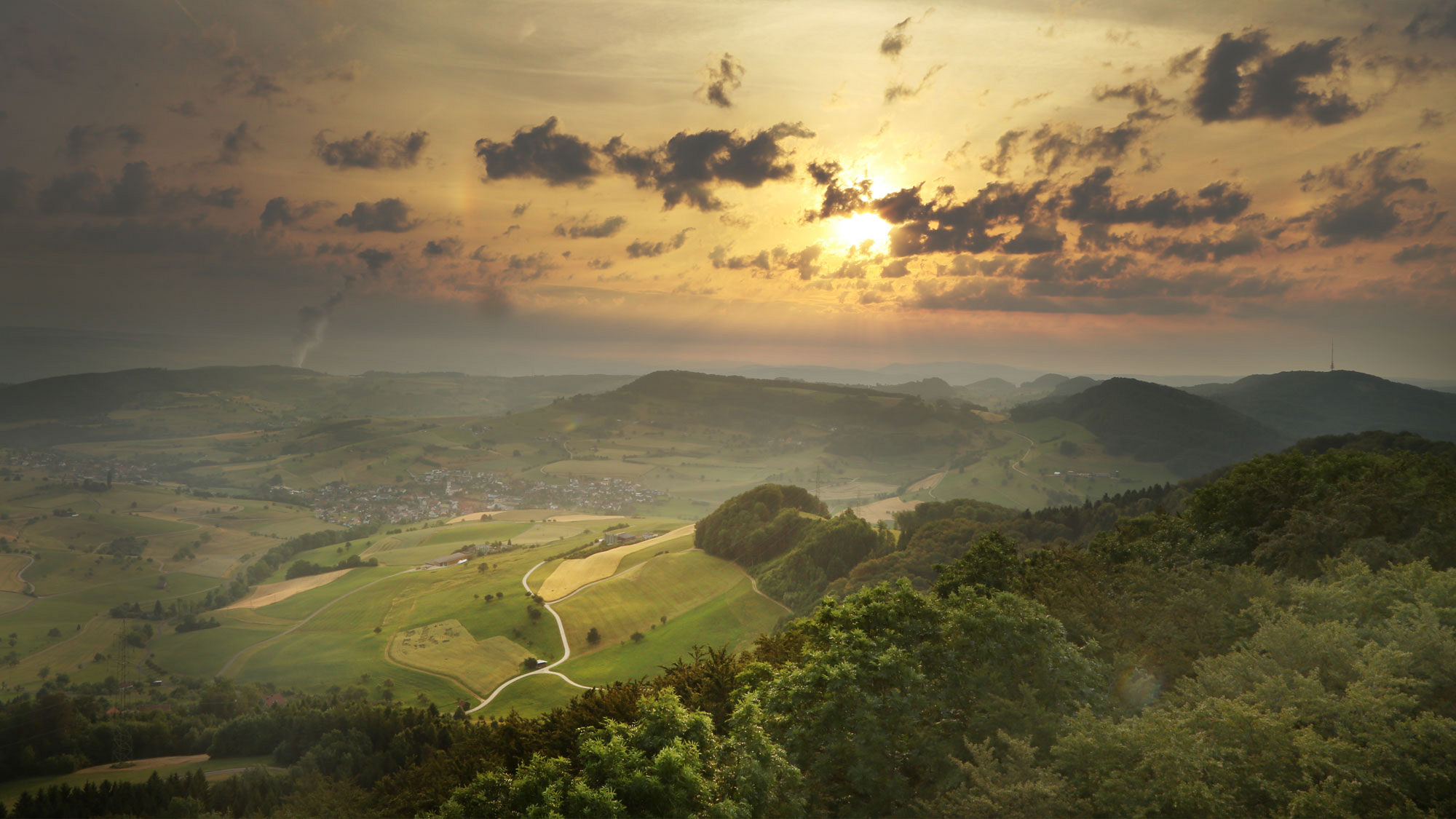 Blick vom Cheisacherturm Richtung Osten. Die Morgensonne steht in einem Wolkenfeld und taucht die Landschaft in warmes Gold.