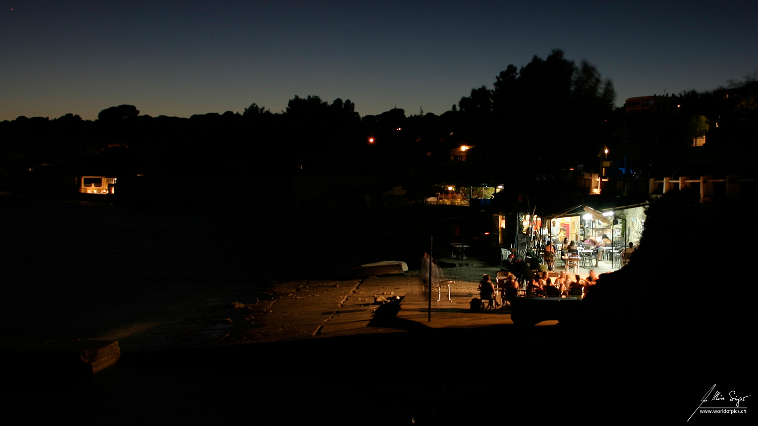 Ein heisser Sommerabend im Süden Frankreichs. Kurz nach der blauen Stunde, in den Bars, die nicht direkt am Strand liegen, sitzen vor allem die Einheimischen. Und so geht ein weiterer Sommertag zu Ende.