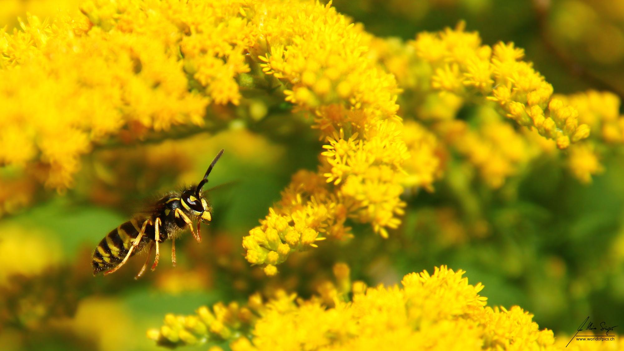 Eine Wespe im Landeanflug. Auf dem Bild nicht sichtbar: Die Wespe machte offensichtlich Jagd auf die Bienen und Fliegen im Strauch. Die reiche Blütentracht zog zahlreiche Insekten an, welche die Wespe gezielt attakierte.