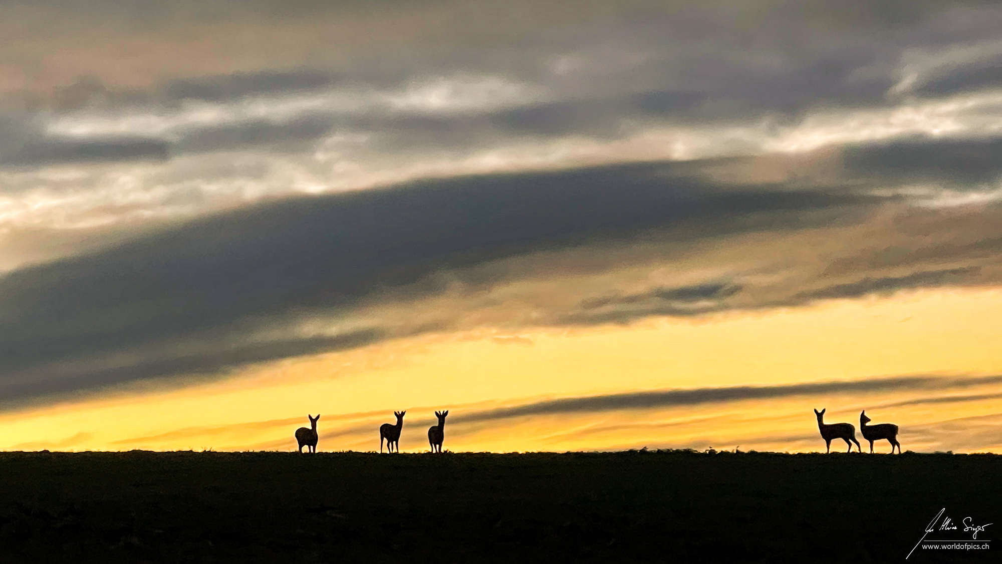 Ein Sprung Rehe in der winterlichen Morgendämmerung. Das Bild entstand auf einem Spaziergang recht spontan mit dem Handy. Ein überaus fragiler Moment, der wenige Sekunden dauerte und einen mit dem Gefühl, etwas ganz Besondem teilhaftig geworden zu sein, zurücklässt...