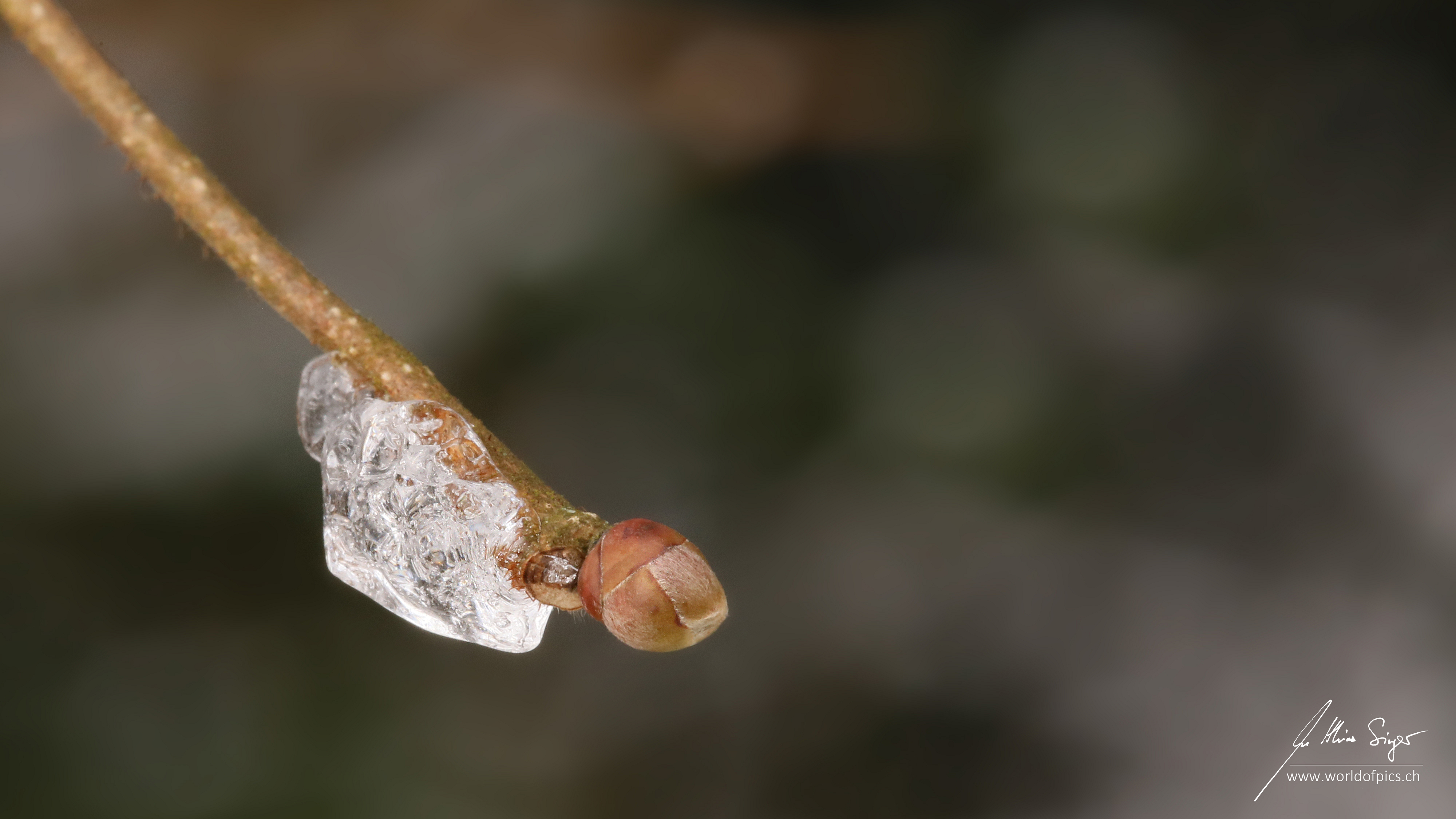 So winzig der Eistropfen, so schwer sein Gewicht für dieses dünne Ästchen.
