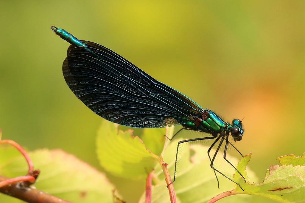 Rendez-vous der besonderen Art am Ufer eines kleinen Baches. Diese Blauflügel-Prachtlibelle ist etwa sieben Zentimeter lang und wie bei diesem Männchen - und im Gegensatz zur Gebänderten Prachtlibelle - komplett blaugrün.