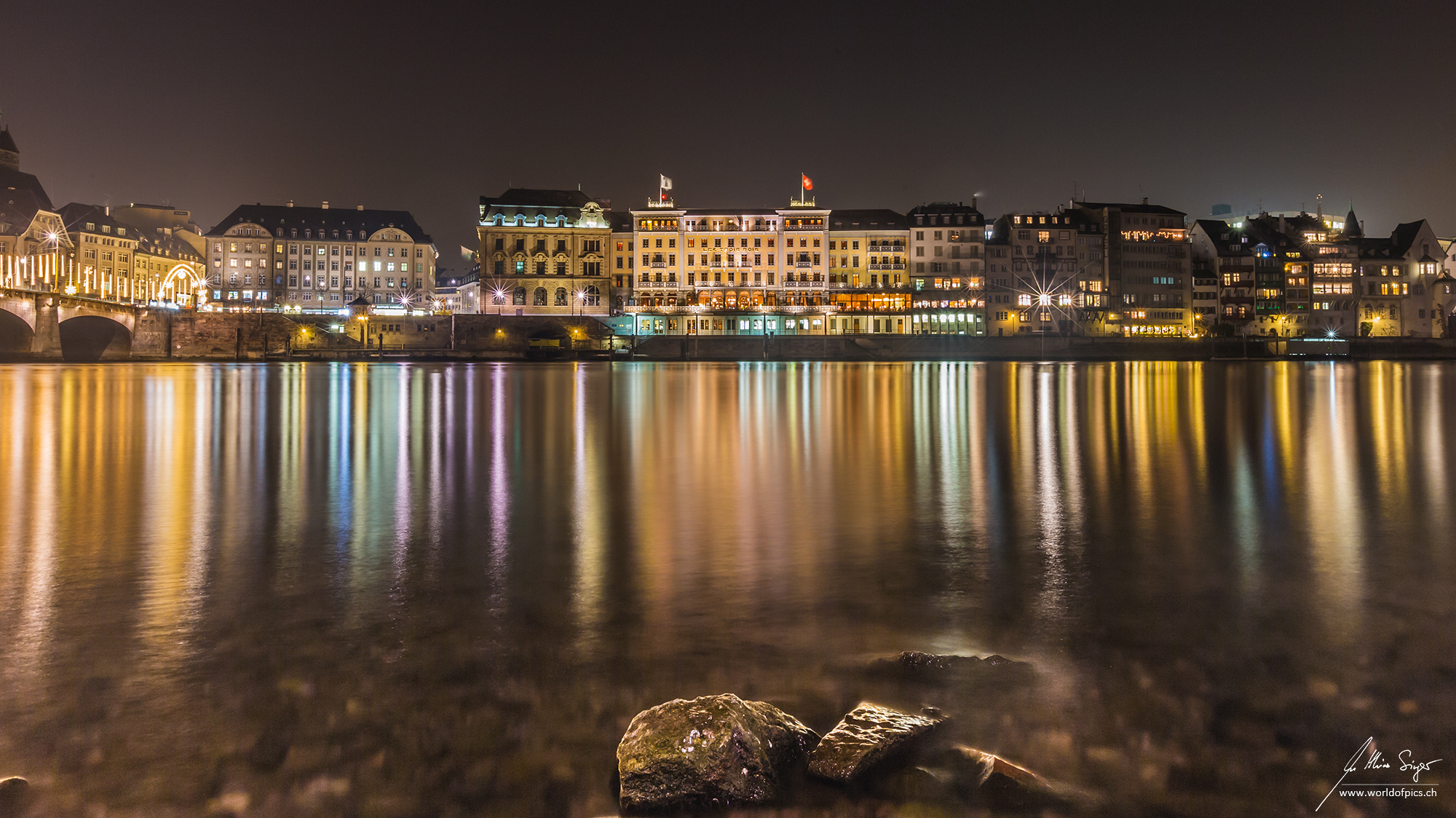 Das Basler Nobelhotel "Drei Könige" vom unteren Rheinweg aus in der Vorweihnachtszeit 2015. Ich habe das Bild aus einer dreistufigen Belichtungsreihe zusammengerechnet und das Flusswasser etwas weichgezeichnet. Die Herausforderung war, dass die Lichter in den Fenstern nicht zu hell würden, damit man in die Räume sieht - gleichzeitig aber die Details draussen genügend Licht haben, um klar erkennbar zu sein.