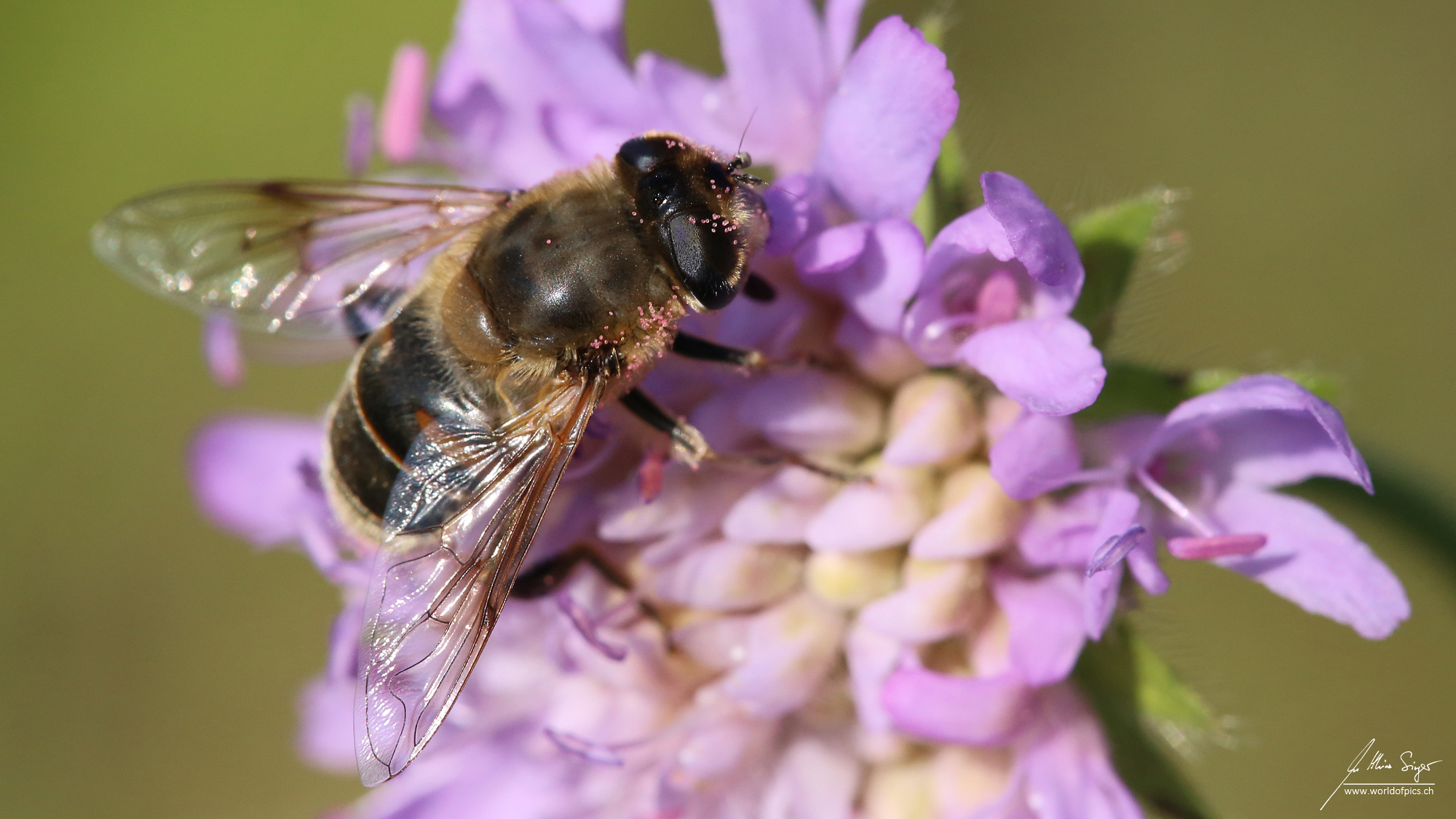 Die Mistbiene ist eine weit verbreitete Schwebfliegenart. Sie wird auf den ersten Blick häufig für eine Honigbiene gehalten, weil sie deutlich grösser ist, als andere Schwebfliegenarten. Im Gegensatz zur Honigbiene hat die Mistbiene aber keinen Stachel. Das Geschlecht kann man übrigens anhand der Augen unterscheiden: Bei den Männchen stoßen die Augen an der Stirn zusammen, bei den Weibchen sind die Augen deutlich voneinander getrennt.