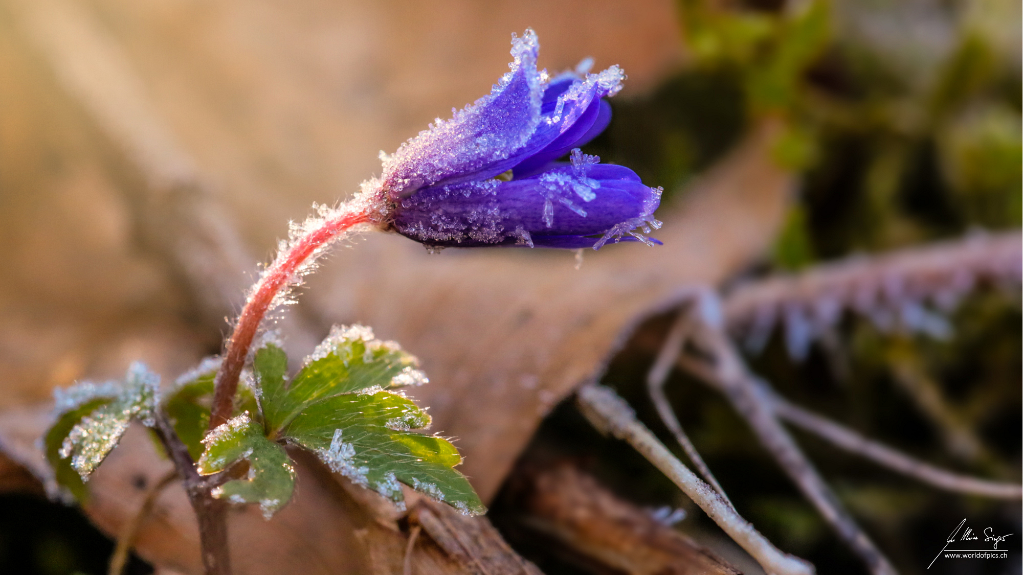 Eine kleine Glockenblume - wobei es dem Blatt nach wahrscheinlich eben keine Glockenblume ist - nach einer kalten Nacht. Bald werden die ersten Sonnenstrahlen des Tages den Reif auf der Blüte verschwinden lassen, und die frühlingshalfte Wärme wird sie weiter wachsen lassen.