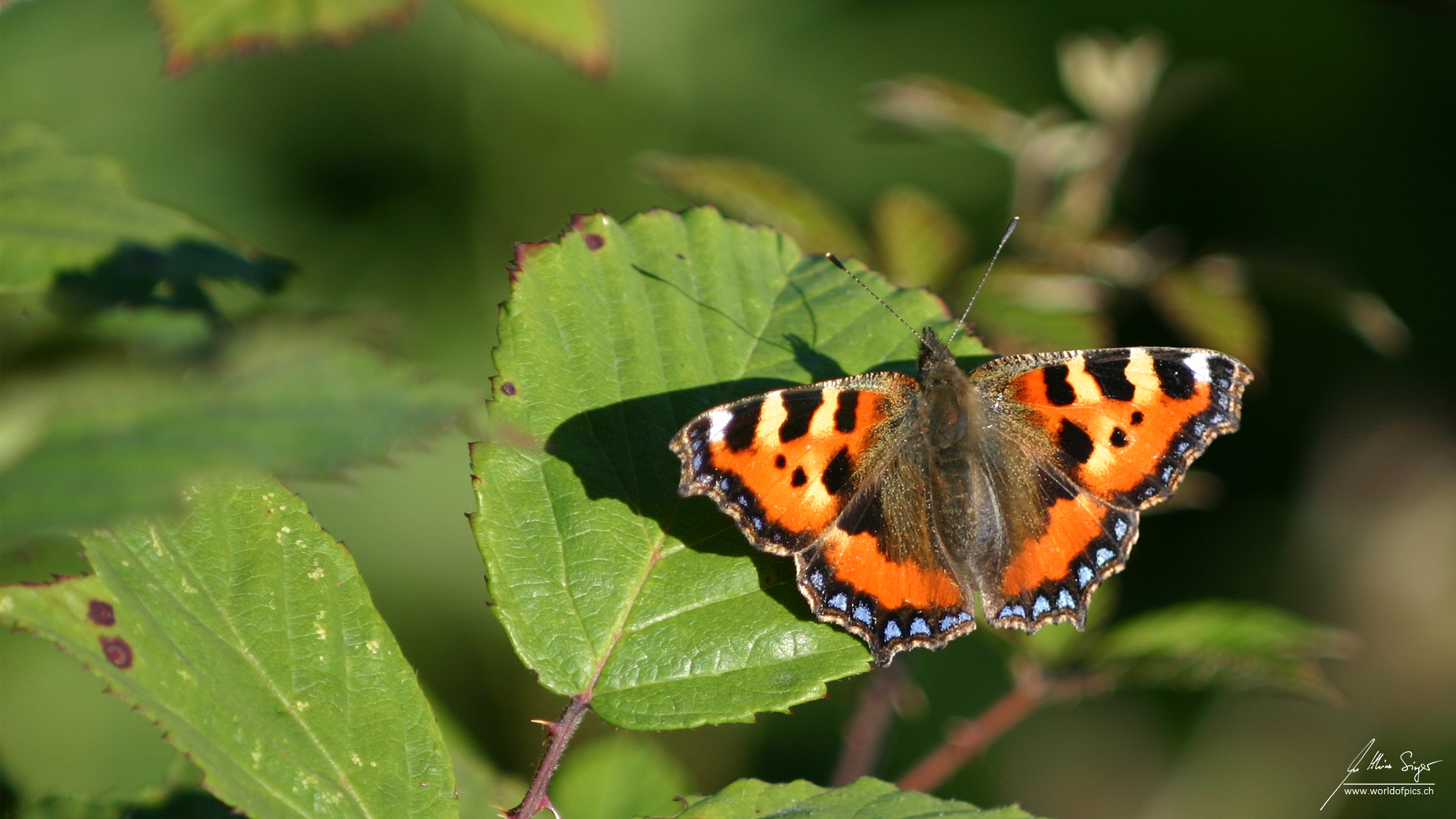 Dieser Kleine Fuchs (Aglais urticae) lief mir 2005 in Irland vor die Linse. Der herrliche Sommerabend an der irischen Südküste liess ihn auf den Blättern einer ausgedehnten Brombeerhecke verweilen. Der Kleine Fuchs ist ein Edelfalter. Eine auffälligen, schwarz-gelben Raupen ernähren sich von Brennnesseln.