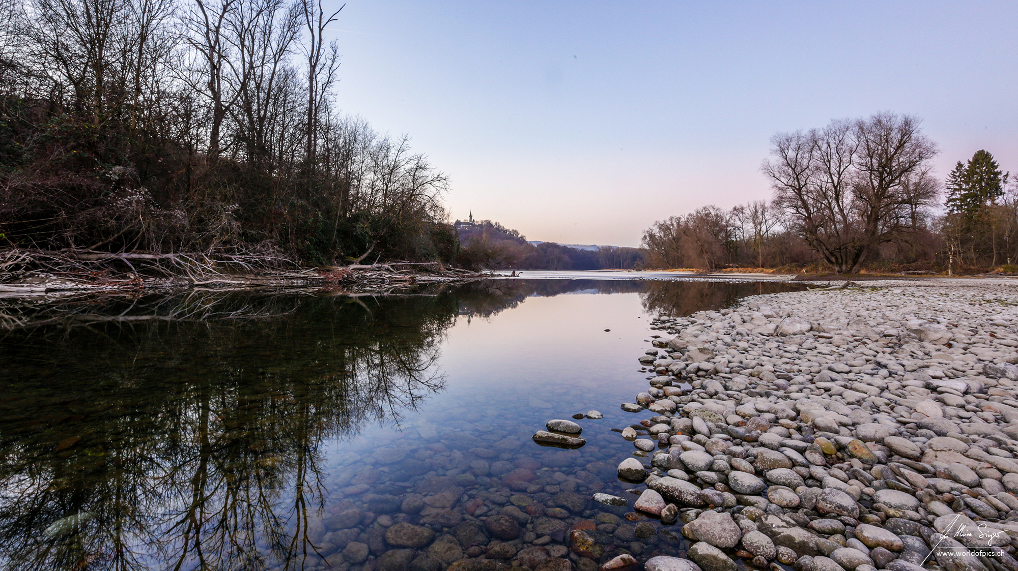 Die Aare zwischen den Zusammenflüssen von Reuss und Limmat. Zum Jahresende 2016 hatten die Flüsse einen extrem niedrigen Wasserstand, so dass die Aareinsel auf der Höhe des Limmatspitzes mit Gummistiefeln erreicht werden konnte. Das Bild zeigt den Flusslauf unmittelbar vor der Mündung der Limmat. In der Bildmitte ist deutlich die Kirche Rein erkennbar.