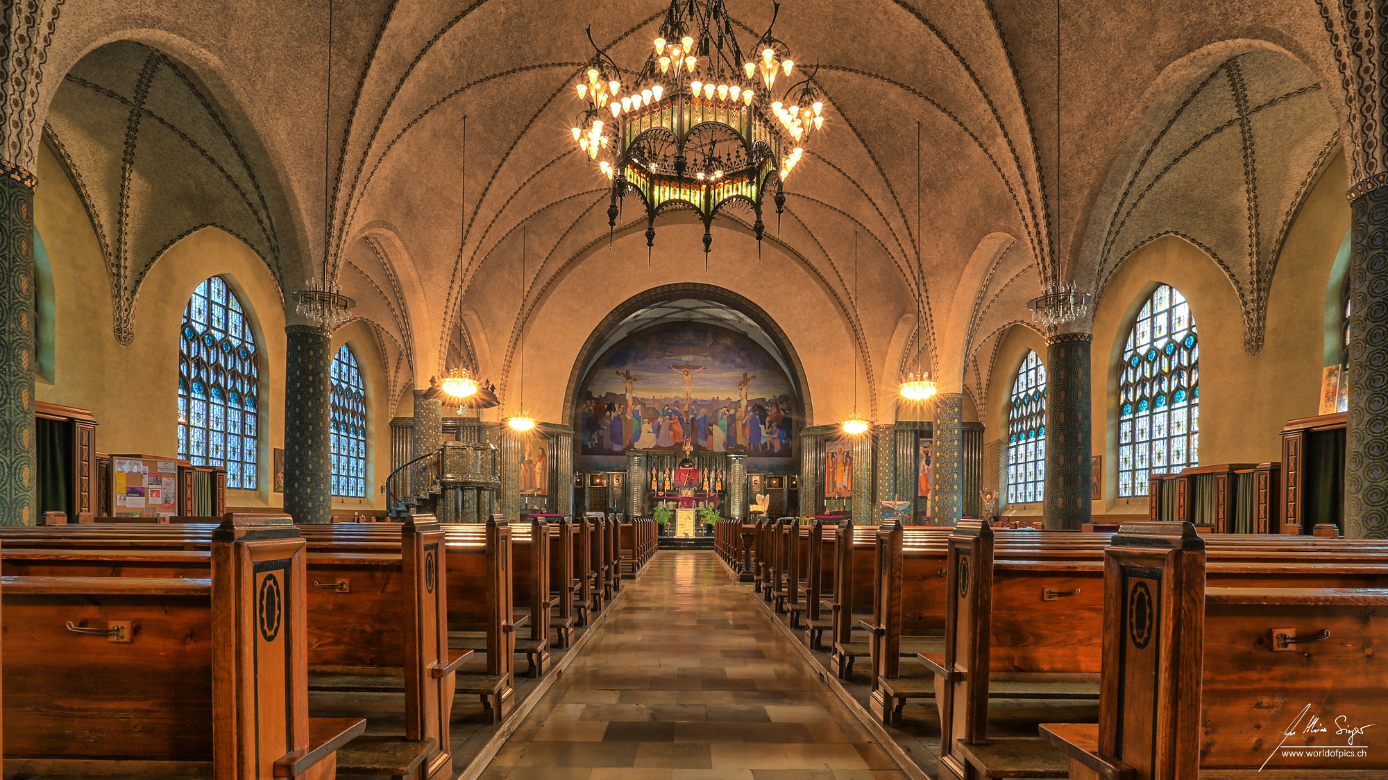 Das Schiff der Pauluskirche in Luzern mit Blick auf den Altar an einem Winternachmittag.