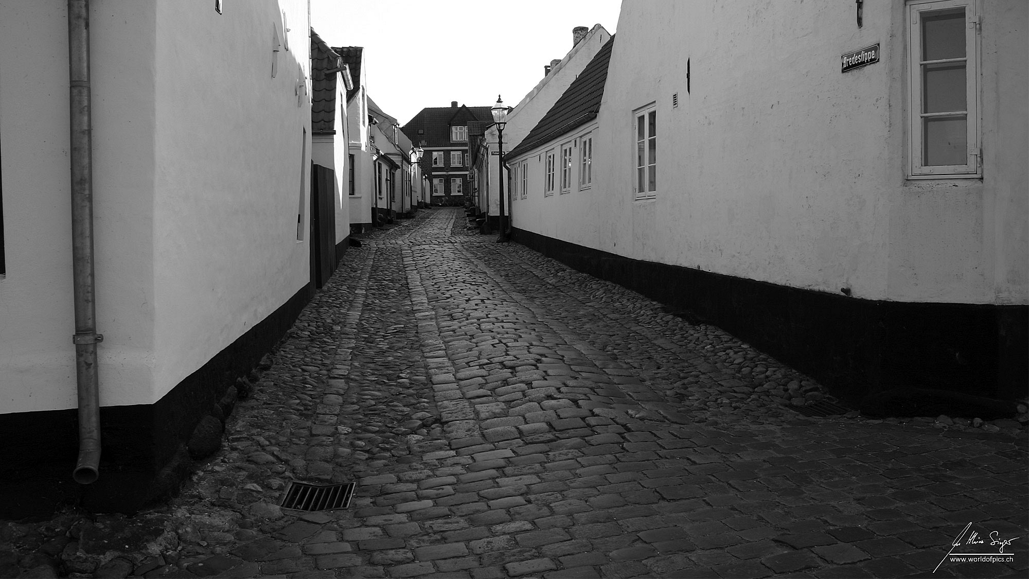 Eine der vielen kleinen, gepflasterten Strassen in der wunderhübschen Kleinstadt Ribe im Südwesten Dänemarks. Die Stadt war ursprünglich ein Hafen, liegt inzwischen aber ein paar Kilometer vom Meer entfernt und ist nur noch durch einen schmalen Kanal mit der offenen See verbunden.