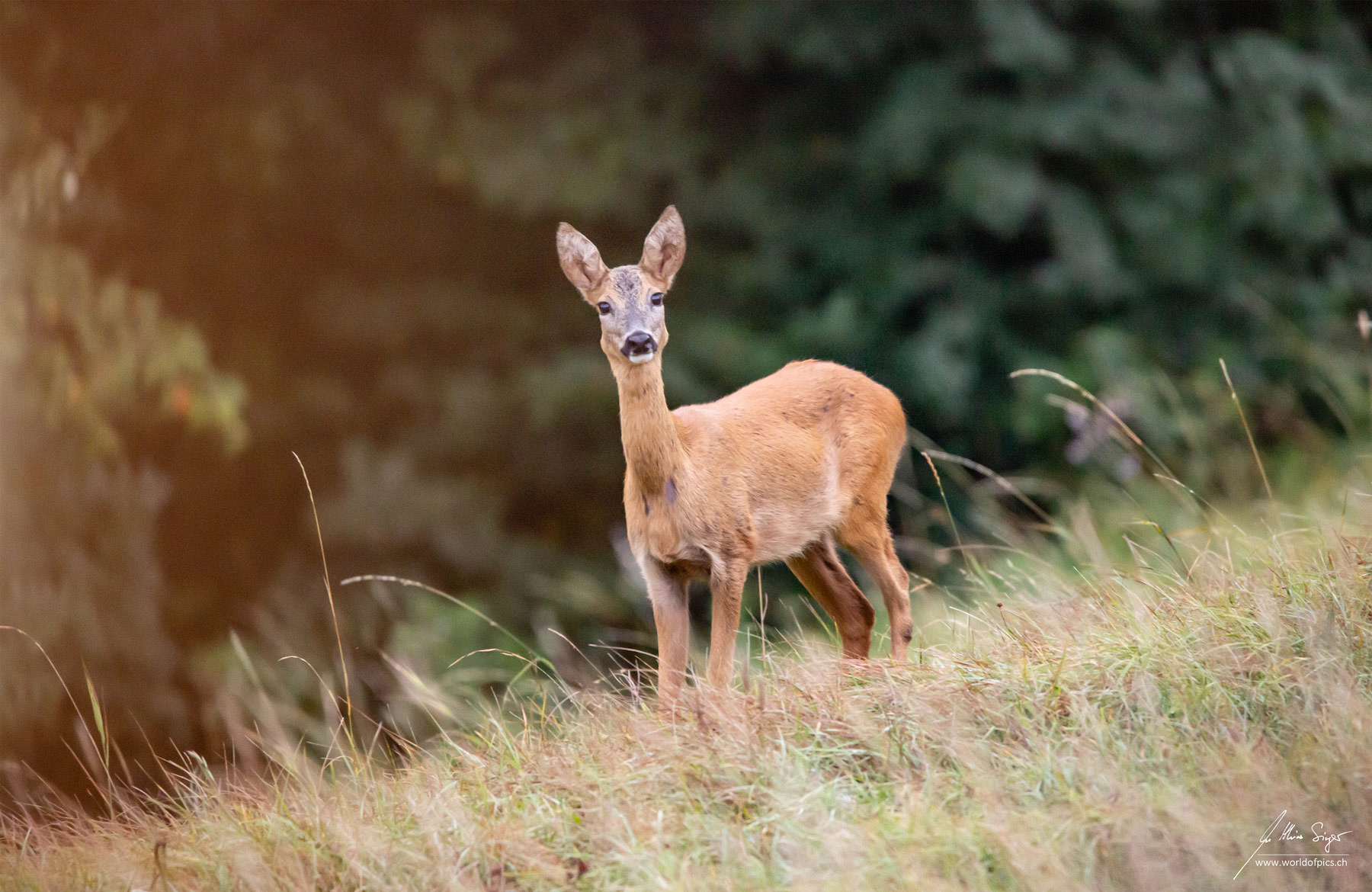 An einem regnerischen Morgen Ende August kreuzte diese Ricke meinen Weg. Die Rehgeiss war mit dem Kitz unterwegs.
