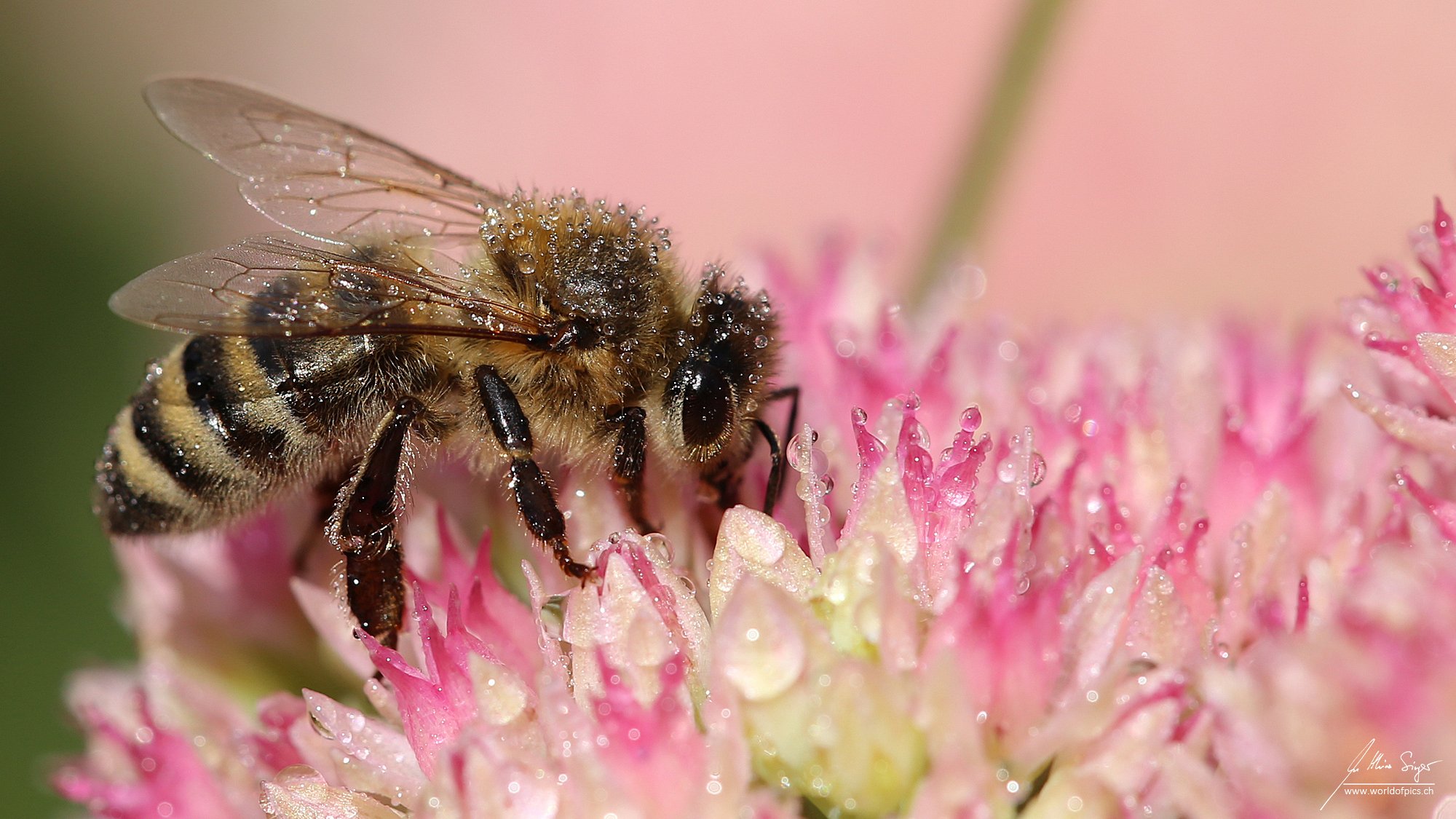 Die Biene liess sich vom Rasensprenger nicht im geringsten beeindrucken und sammelte unverdrossen weiter Nektar.