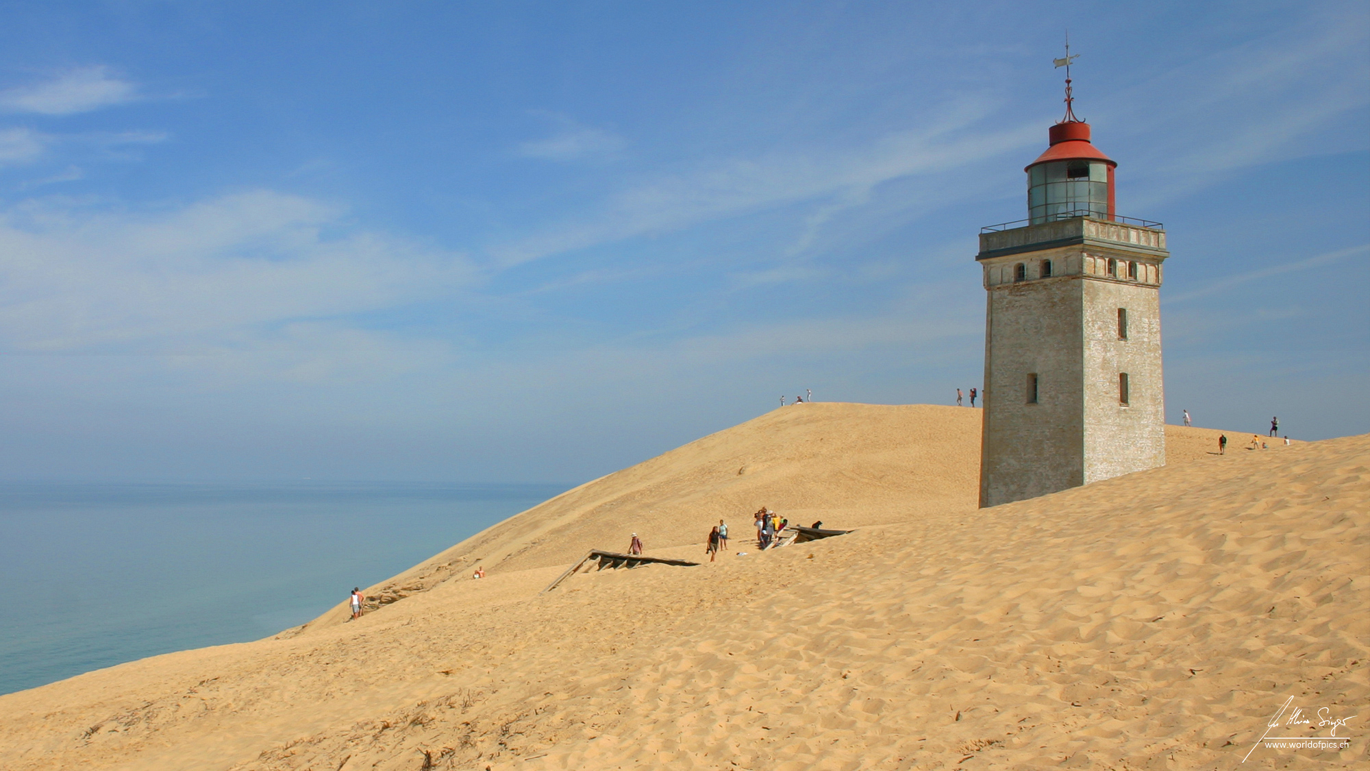 An der Westküste Jütlands, dem Festland von Dänemark, weit im Norden zwischen Lønstrup und Løkken befindet sich eine eindrucksvolle Naturschönheit: Die Wanderdüne Rubjerg Knude. Die Düne an sich - ein Haufen Sand an der Küste - ist nicht so sehr spektakulär. Viel spannender ist, dass die Düne in den letzten 30 Jahren einen kompletten Leuchtturm verschluckt hat. Mittlerweile sieht man davon nur noch den oberen Teil des Turms. Damals - 2006 als dieses Bild entstanden ist, waren zumindest noch Teile des Nebengebäudes sichtbar.