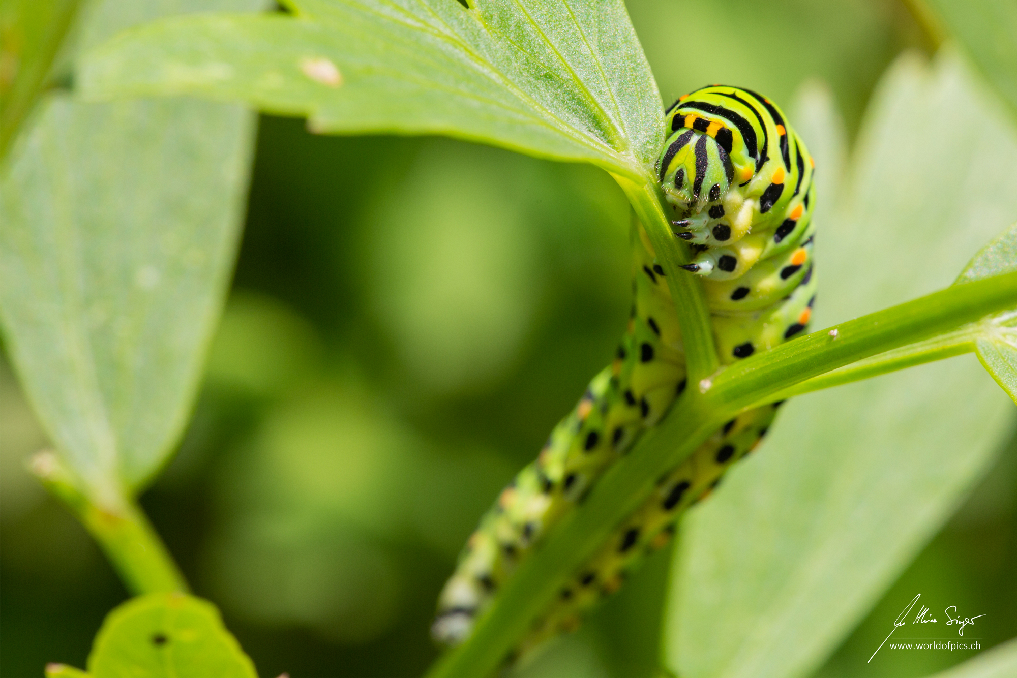 Natürlich ist die Metamorphose von der Raupe zum Schmetterling in jedem Fall ein bewegendes Schauspiel, ein überaus eindrücklicher Prozess. Doch bei den Edelfaltern - insbesondere beim Schwalbenschwanz - ist dies zusätzlich bewegend. Schon die Raupe, hier auf einem Liebstöckel als Futterpflanze, ist alleine aufgrund ihrer Farben eine Augenweide.