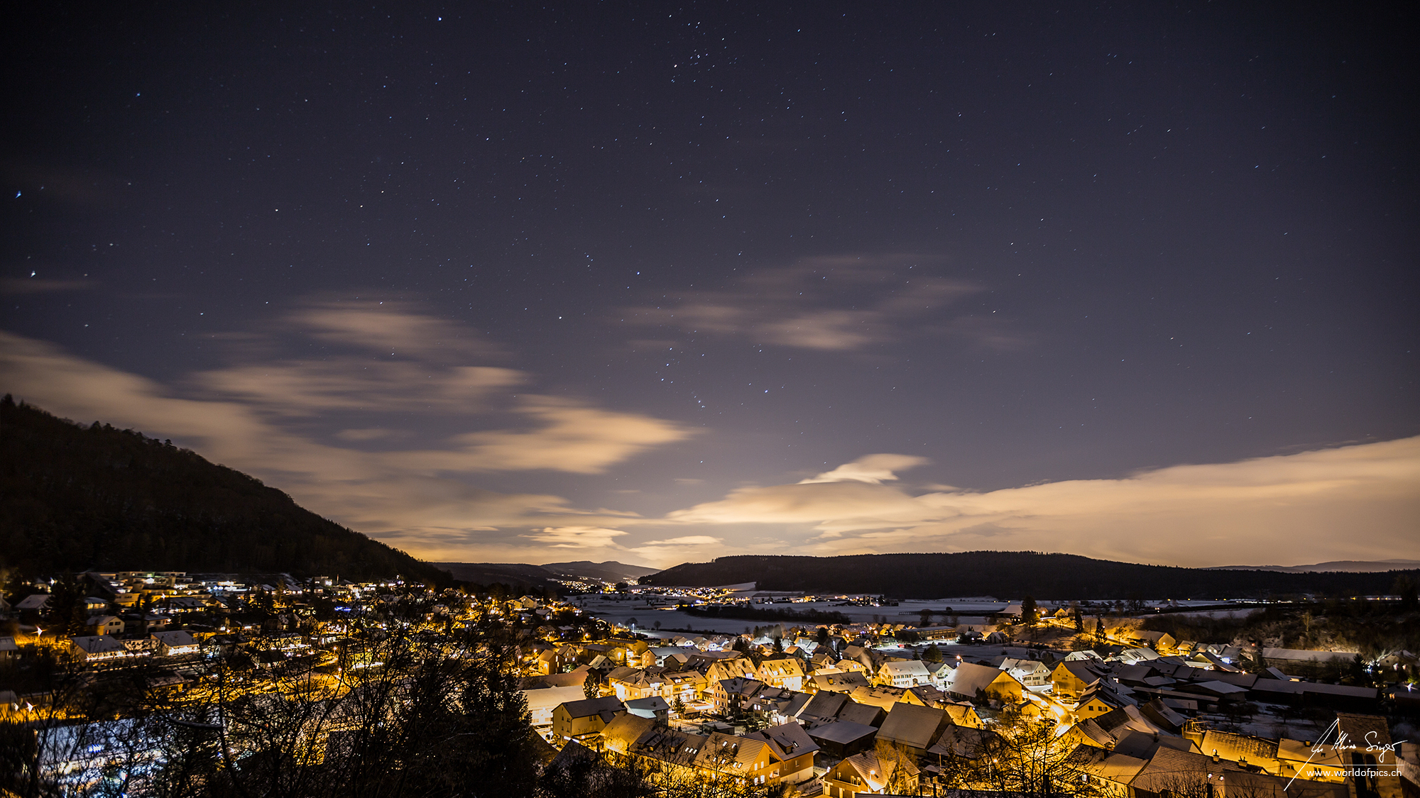 Doch Sternenhimmel sind für mich komplettes Neuland. Am Abend des 5. Januar hatten wir nach einer längeren Nebelperiode wieder mal klaren Sternenhimmen, und da habe ich mich spontan aufgemacht, um das zu testen. Im vollen Bewusstsein, dass bei uns in der Nähe des Dorfes die Lichtverschmutzung enorm ist - und zudem durch den Schnee die Helligkeit weiter verstärkt wird, habe ich mal einen ersten Versuch gemacht, bin überrascht: Die Sterne sind sehr deutlich zu sehen und bereits so, ohne grosse Bearbeitung ist das Resultat erstaunlich.