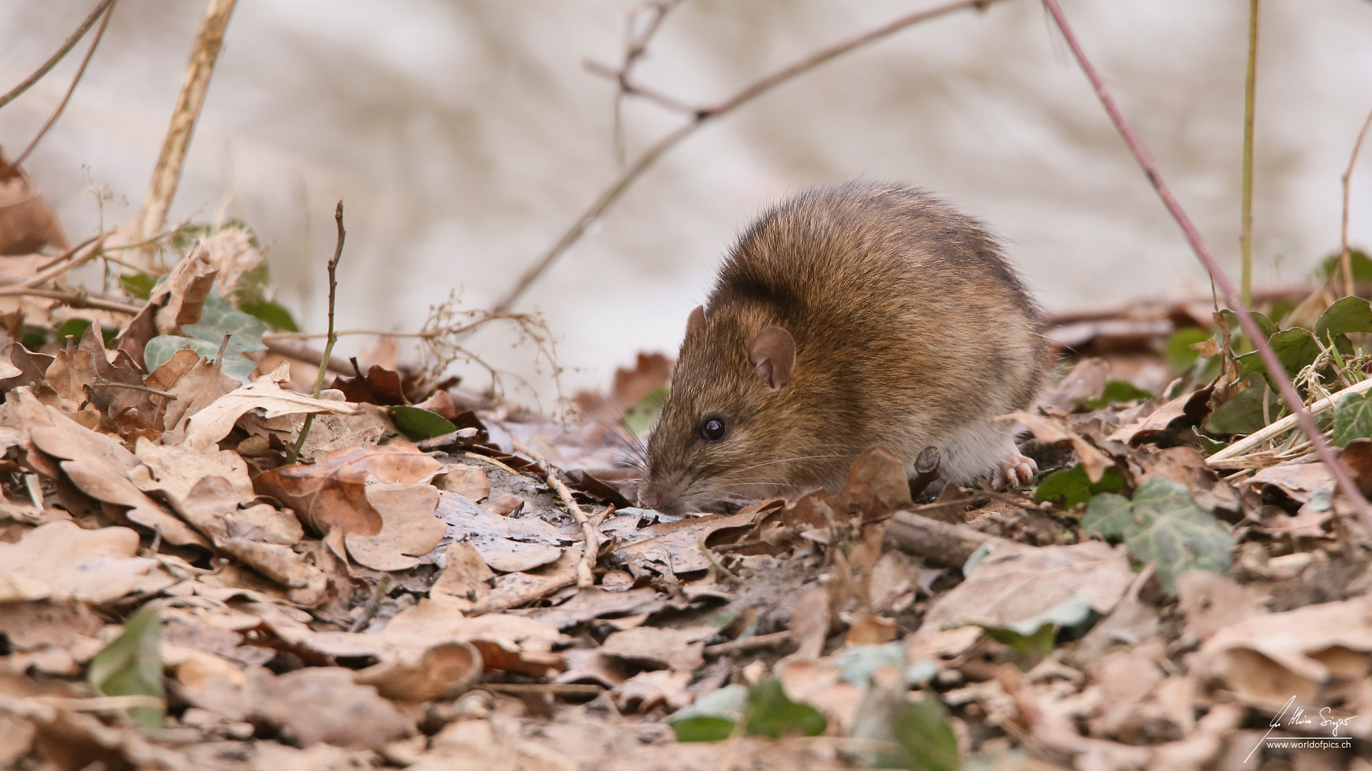 Die Wanderratte, häufig als Schädling bekämpft, ist wie hier am Klingnauer Stausee normalerweise und ursprünglich in buschigem oder bewaldetem Gelände zu Hause.