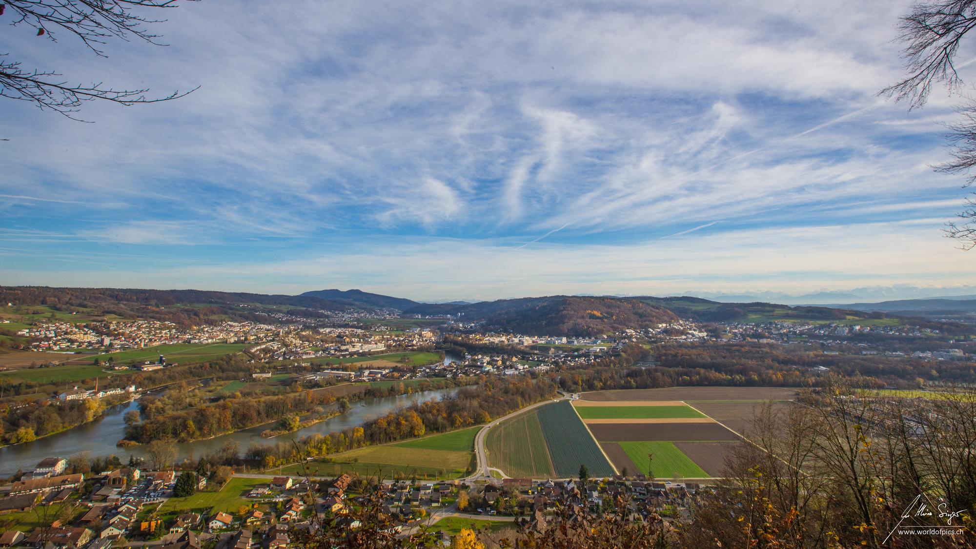 Es ist eine der wasserreichsten Gegenden der Schweiz, das sogenannte "Wasserschloss". Hier fliessen die drei Flüsse Aare (im Vordergrund), Reuss (Zufluss rechts von der Bildmitte) und Limmat (link) zusammen. Die drei Flüsse entwässern gemeinsam mit ihren Nebenflüssen rund 40% der Schweizer Landesfläche. Zum Einzugsgebiet gehören das Berner Oberland, das Voralpengebeit des Kantons Freiburg, grosse Teile der Kantone Waadt, Neuenburg, Solothurn, Aargau, Zürch, Glarus sowie ein Teil des Kantons St. Gallen - und natürlich die Innerschweiz. Ab dem Zusammenfluss der drei Flüsse ist die Aare, bis sie sich in Koblenz in den Rhein ergiesst, der wasserreichste Fluss der Schweiz: Die Wassermenge der drei Flüsse ist 50% höher als jene des Rheins direkt vor dem Zusammenfluss.