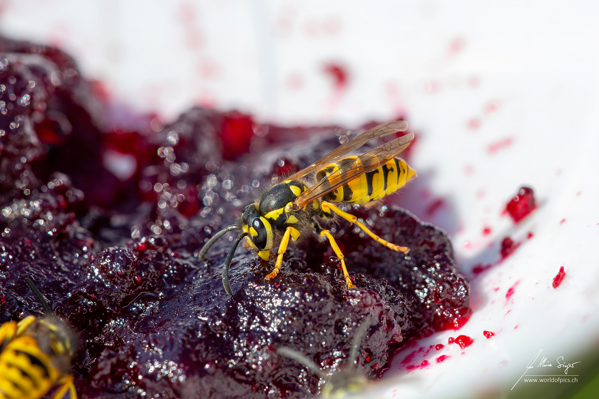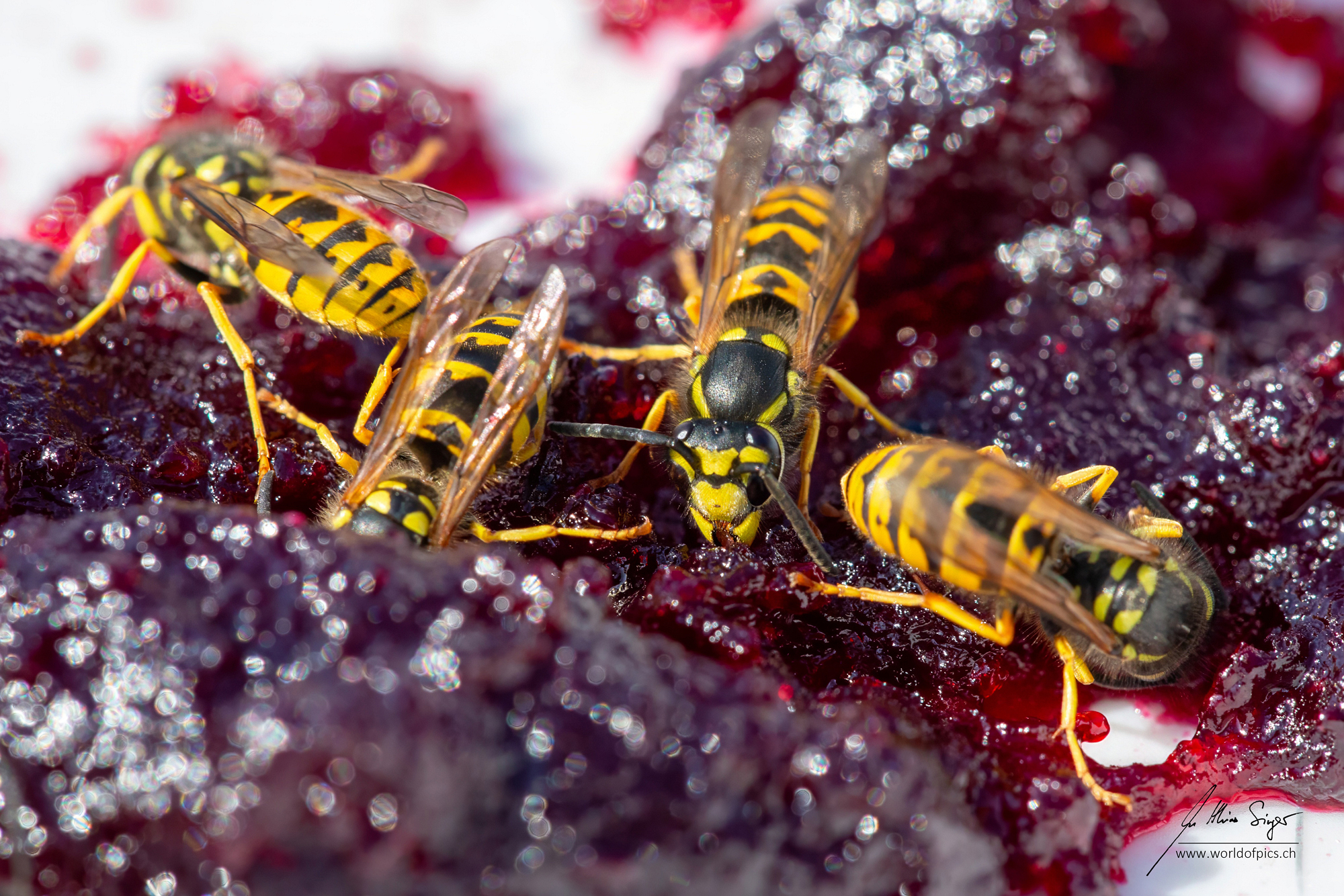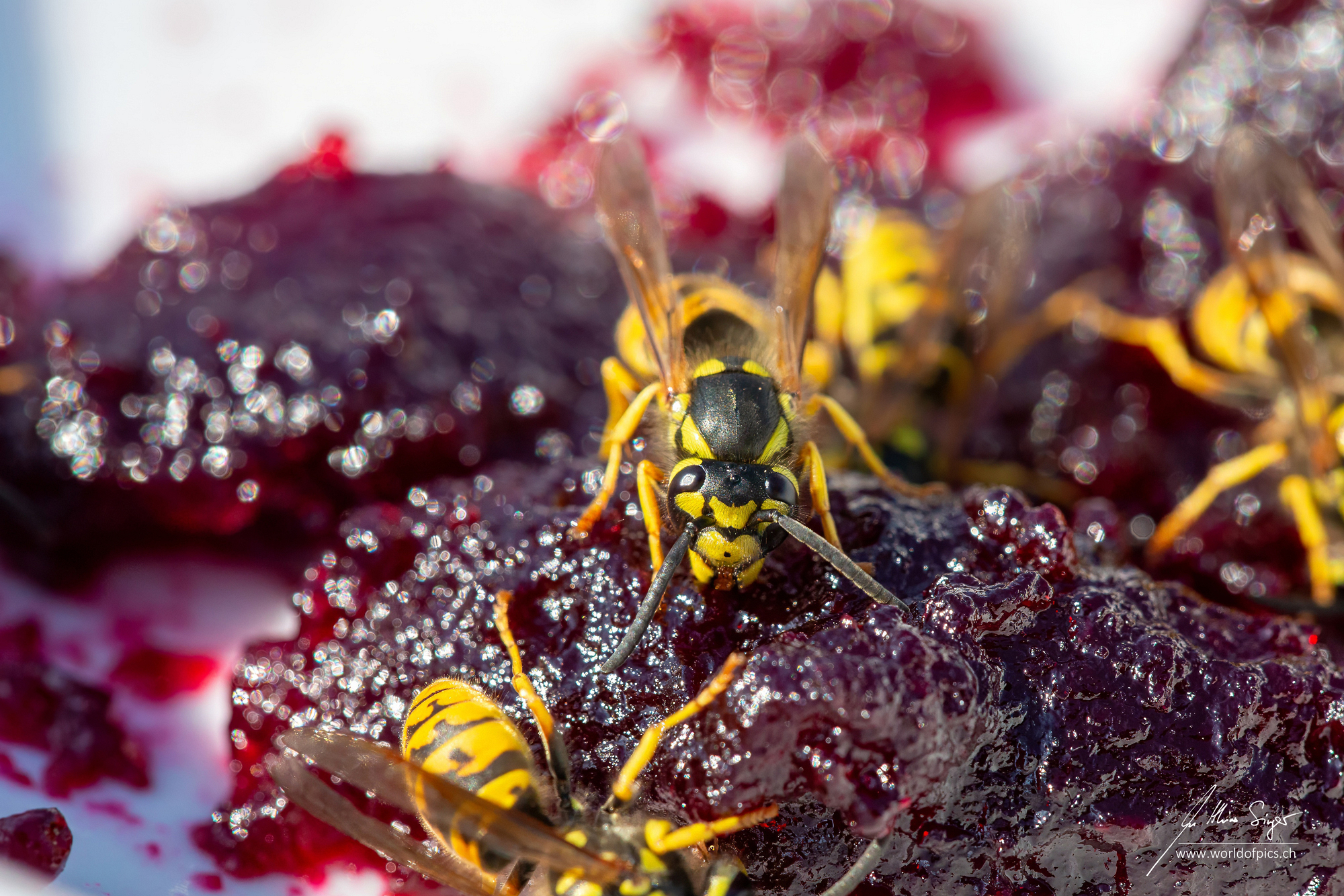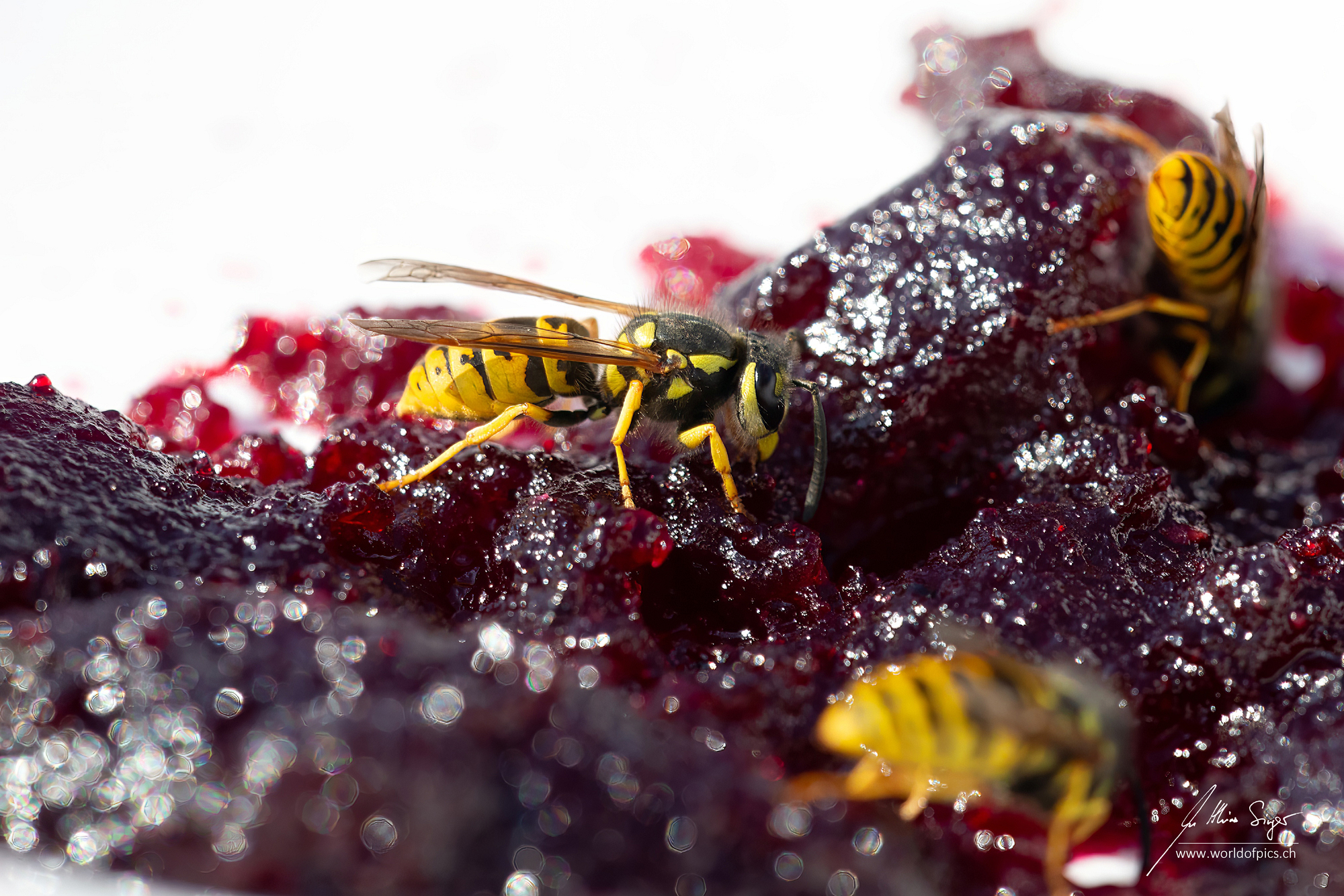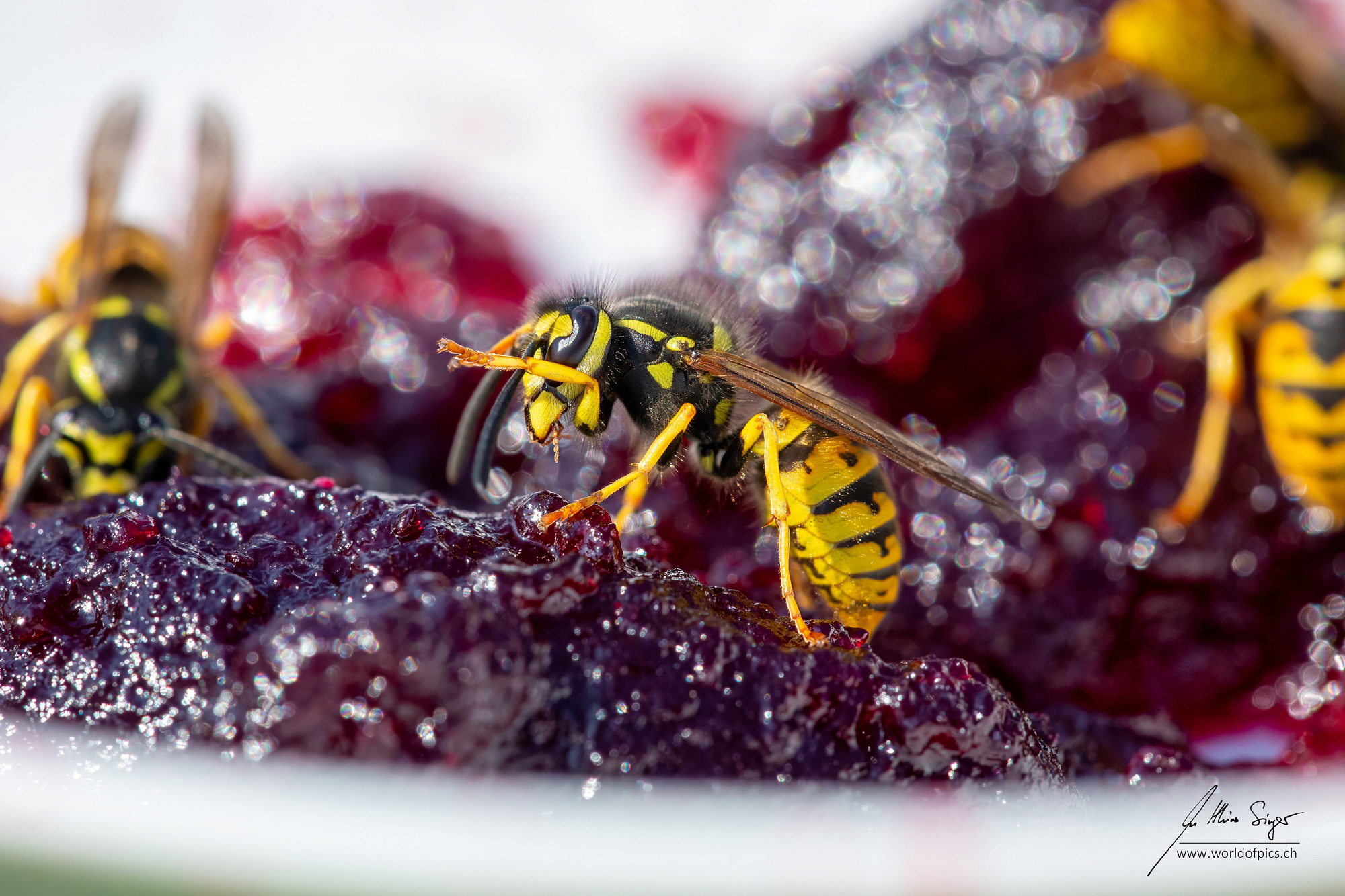 Ich sah, wie die Wespen mit ihren kräftigen Kiefern an den saftigen Stücken der Konfitüre nagten. Der Glanz auf dem Gelée und die reflektierenden Flügel der Insekten erzeugten dabei ein faszinierendes Spiel aus Licht und Schatten. Die Details, die ich in dieser Nahaufnahme festhalten konnte, sind beeindruckend: Die filigranen Strukturen ihrer Flügel, die feinen Härchen auf ihren Beinen und die winzigen, fast unsichtbaren Pollenpartikel auf ihrem Körper – all das wurde erst durch die Makrofotografie sichtbar.