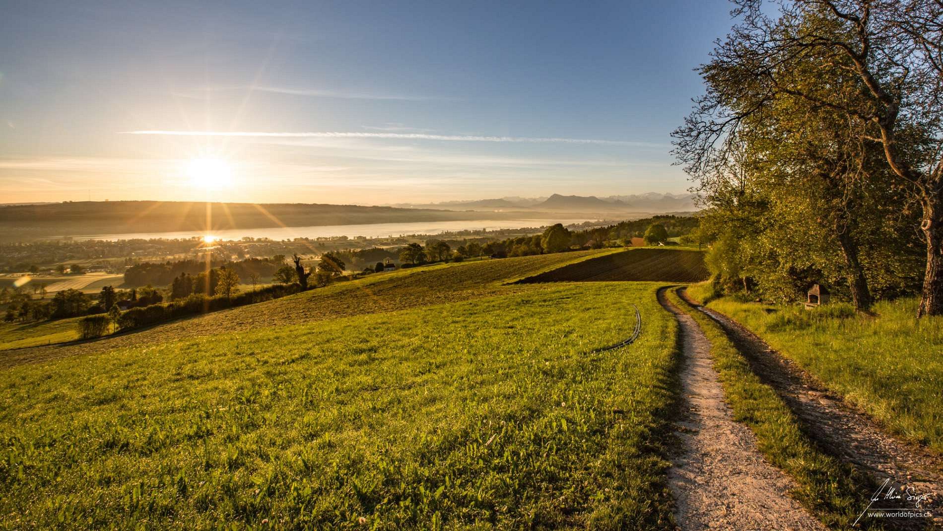 Besonders reizvoll am Bild ist der zweite Sonnenstern im See.